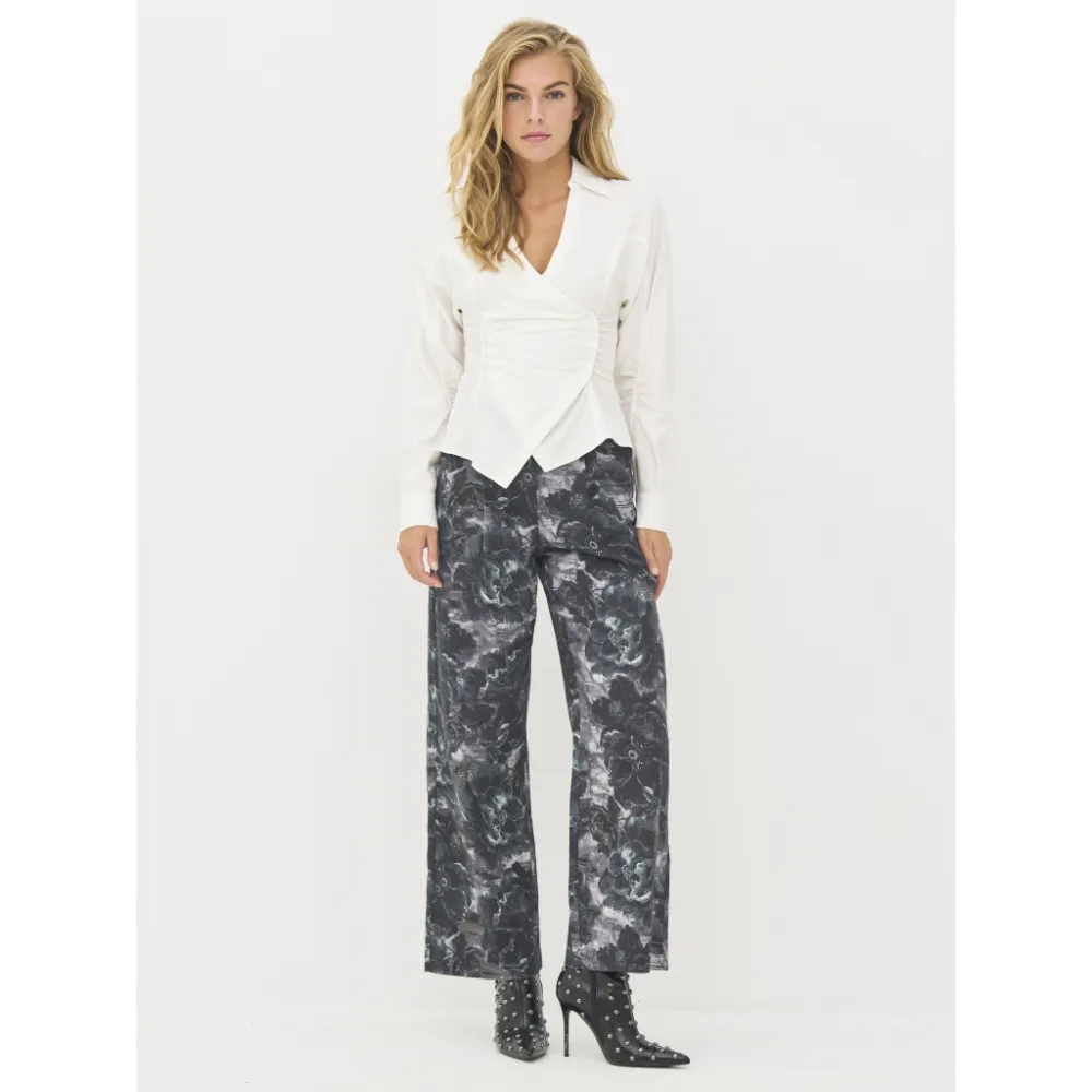 Framhev midjen din med denne elegante skjorten med en omslags-effekt og en tilpasset passform. De fine foldedetaljene på sidene og ermene tilfører bevegelse og struktur, mens det spisse frontstykket skaper en sofistikert silhuett. Kragen og knappestengningen understreker det klassiske utseendet med et moderne preg.