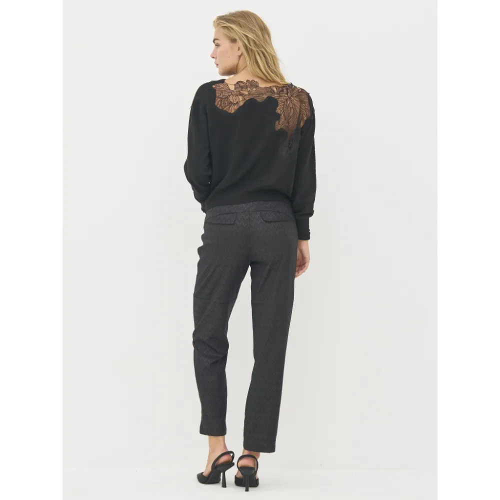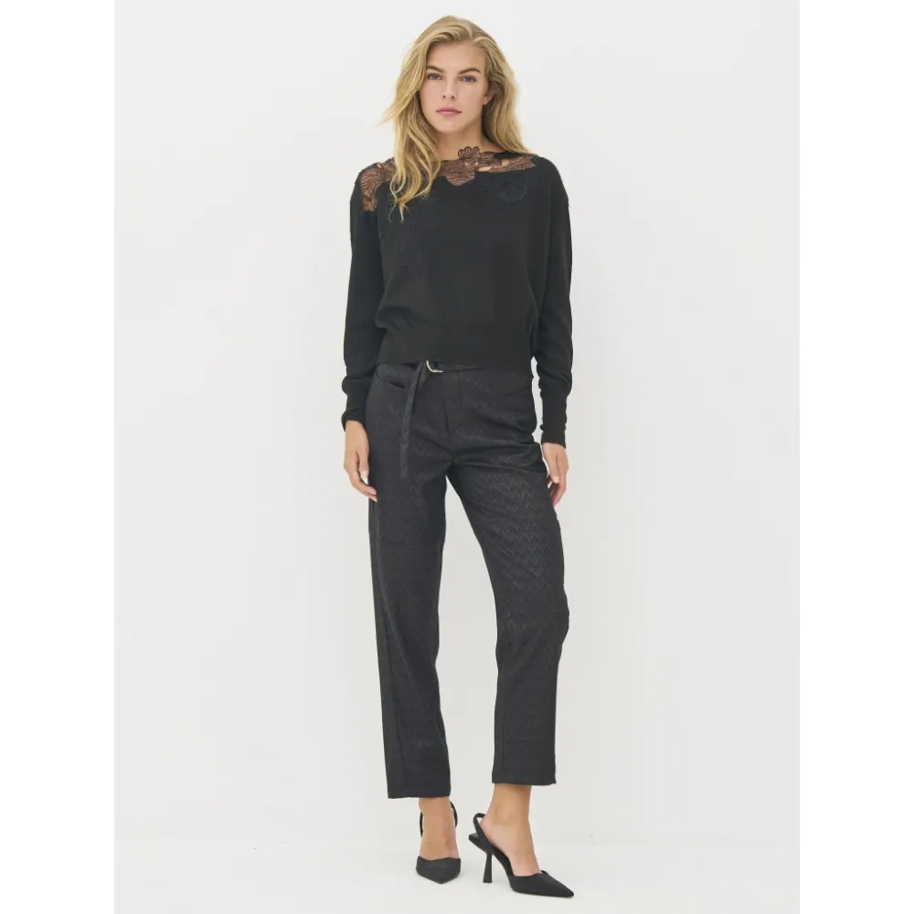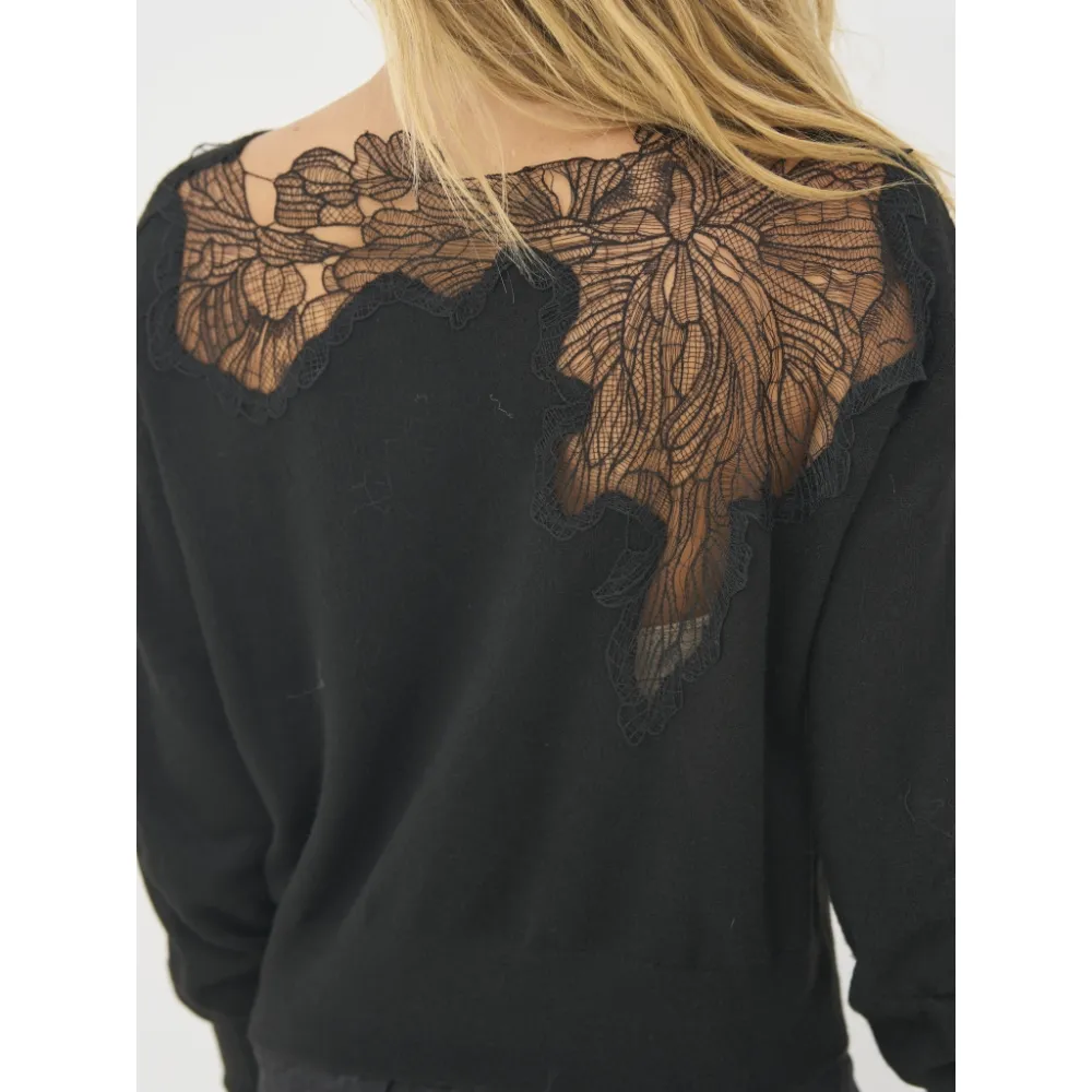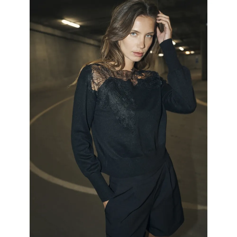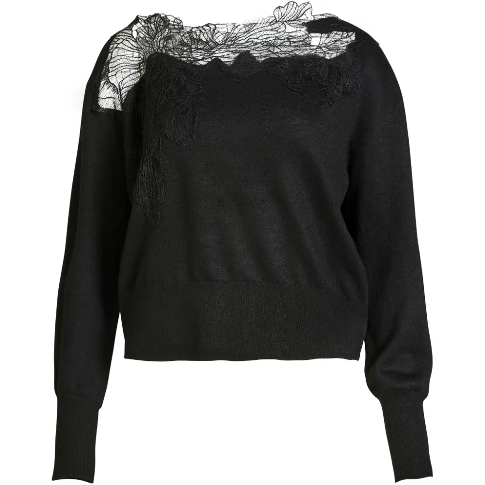 Skap en elegant og feminin uttrykk med denne fine blusen som har dekorative blonder applikasjoner. Den delikate blonder pryder både foran og bak, og legger til en sofistikert vri på den myke strikken. Blusen har en rund hals og lange ermer med brede mansjetter, som fullfører det elegante designet.