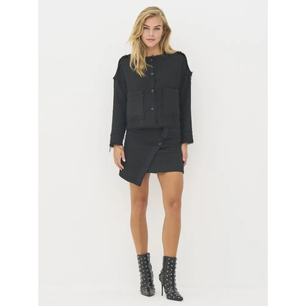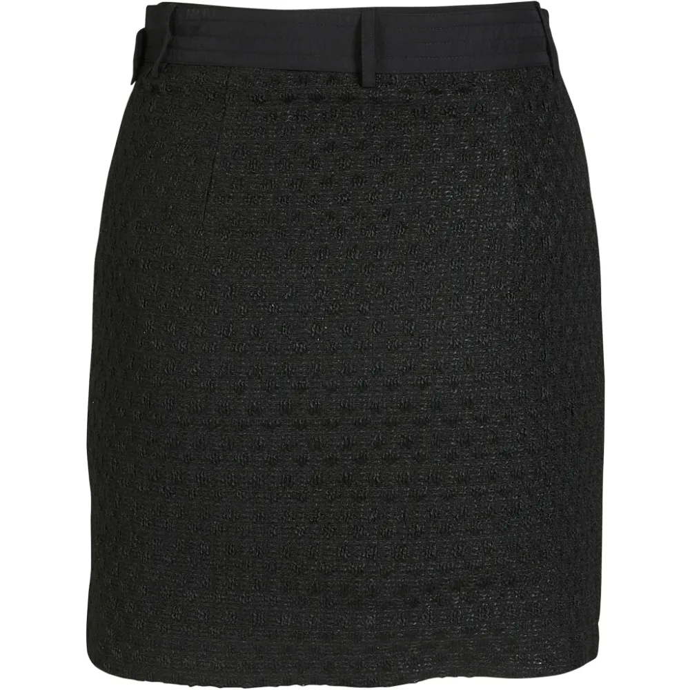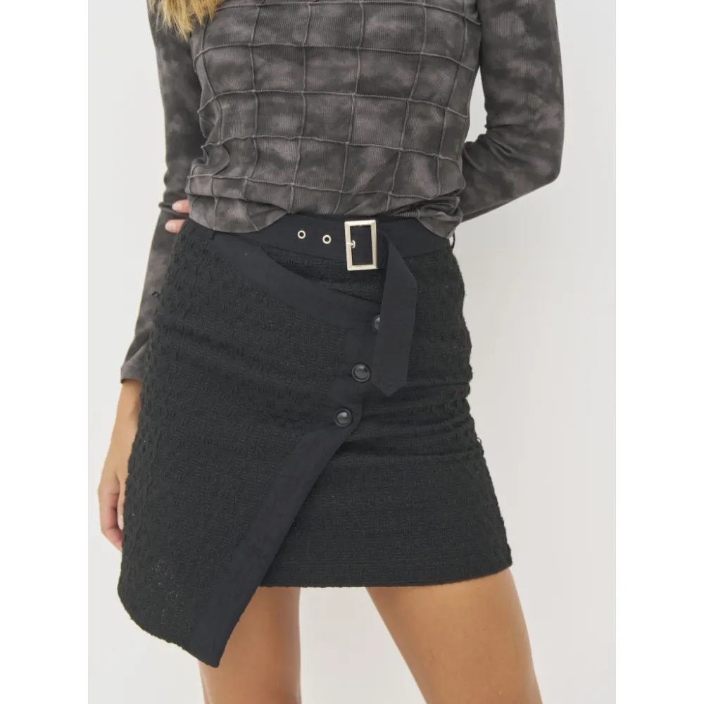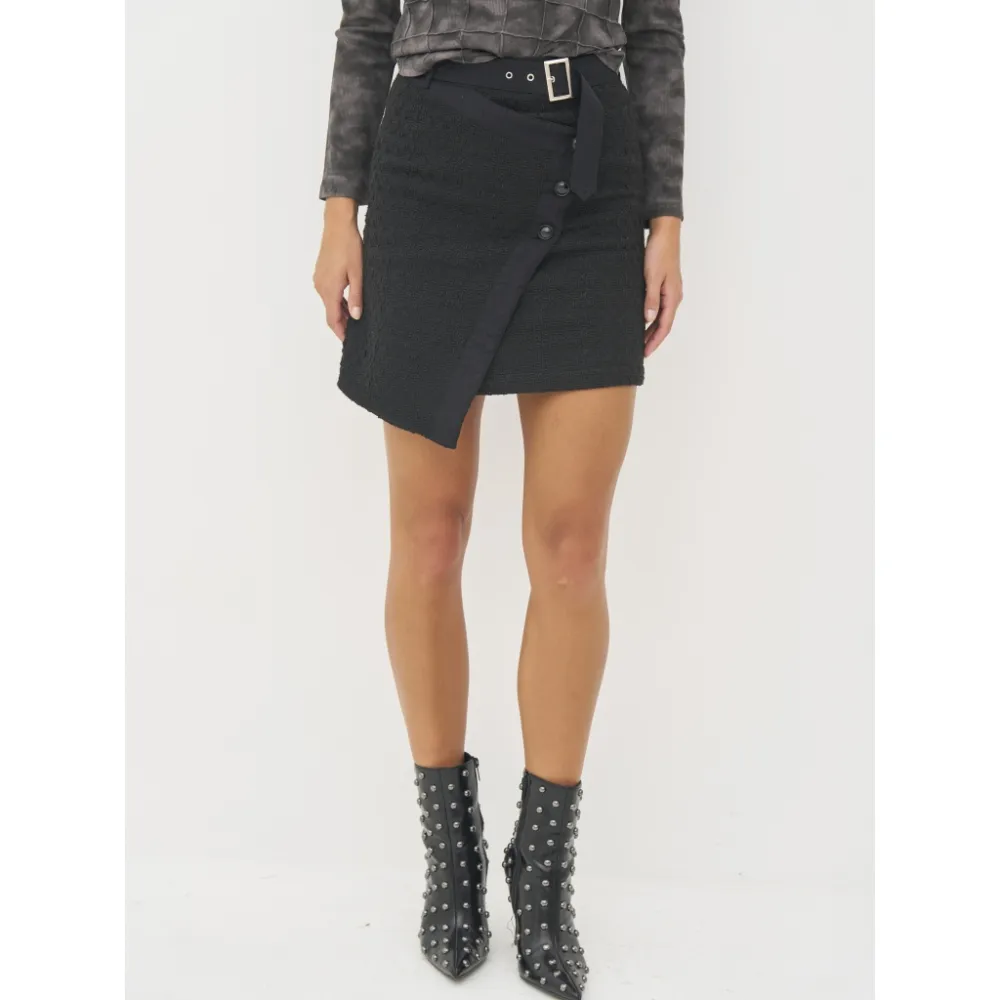 Skap en elegant og moderne uttrykk med denne strukturerte skjørtet i et eksklusivt vevd materiale. Det har en asymmetrisk front med dekorative knapper og en tydelig kantedetalj som legger til en sofistikert tvist. Midjen er accentuated med beltehemper og et tilhørende belte, som sikrer en fin passform og fremhever silhuetten.